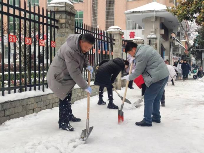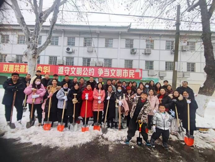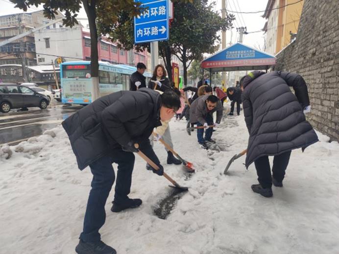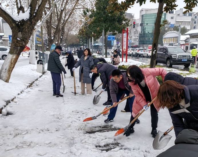 近日,市区出现持续低温雨雪天气,道路积雪成冰。为尽快消除大雪给居民出行造成的不利影响,2月7日上午,公司组织党员干部参加义务清理城区路面积雪活动。公司领导颜建洲、李则俊、曹骥、郭明虎带领党员干部清晨到达郢都路27号路段,大家齐心协力,配合默契,挥动铁锹和石镐,经过一个上午紧张而有序的奋战,终于将包保路段所有积雪清理干净,为居民的安全出行提供了有力保障。