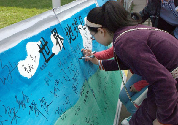 本网讯(员工记者 罗慧 通讯员 朱婵婵)4月22日是世界地球日,当天上午,人文系在一教前举办了“保卫地球 呵护我们共同的家”主题签名活动。